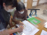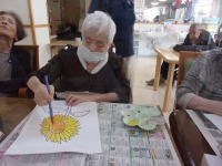 本日は、ひまわりの下絵をご用意し絵具や色鉛筆のお好きな方を選んでいただきました。「ひまわりはお花の中で一番好きだよ」「家の畑のひまわりは日陰に咲いてるんだよ」と各々色々な気持ちで取り組まれました。完成した作品は皆様で観賞し感想を聞き合い、デイルームにひまわりが咲いたようでした(^O^)