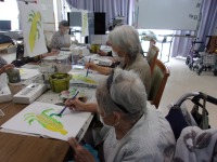 本日は、今が旬のトウモロコシの水彩画を行いました。絵具と色鉛筆の好きな方を選んでいただきました。トウモロコシ一粒一粒塗られる方もいれば、勢い良く一塗りで仕上げてしまう方もいらっしゃり、自由に個性溢れる美味しそうな水彩画が完成しました。デイルームに飾らせていただき、皆様と観賞会を楽しみたいと思います(*^_^*)