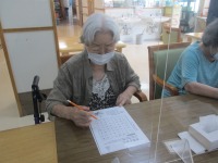 本日は、都道府県ビンゴ&サイコロゲームを行いました。24マスあるビンゴシートに思いつく都道府県を書いていただきます。すぐ書き終えてしまう方もいれば、なかなか思いつかない方もいました。さすがに群馬県は真っ先に書いていらっしゃる方が多く脳トレにもなりました。サイコロゲームでは、一人ずつサイコロを振って質問に答えていただきます。「好きな食べ物は?」「初恋の思い出は?」「新婚旅行はどこへ行きましたか?」等思い出話に花が咲きたいへん盛り上がりました(^O^)