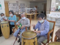 こんにちは、デイサービスです。今日の音楽レクは職員が自宅から持参した、カホン、ジャンベ、コンガ、ボンゴ等の楽器に実際に触れて演奏してもらいました。皆さん初めて目にする楽器に興味を持たれ「太鼓にもいろんな種類がるんだね。」等、感想を話されていました。楽器に少し触れて使い方がわかった所で実際に松任谷由美さんの「真夏の世の夢」のカラオケを流して演奏に参加してもらいました。リズムに乗ってテンポよく楽器を叩く様子がとても楽しかったです(*^_^*)