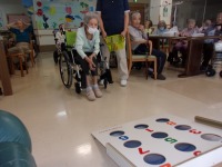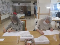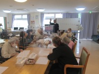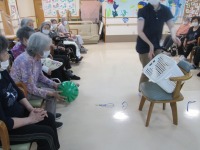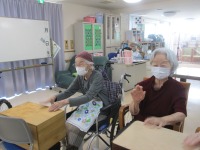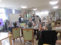 本日は、職員による手書きのプリントをご用意し各々取り組んでいただいた後、皆で一緒に答え合わせをしました。「連想ゲーム・ならびかえクイズ・夏漢字ひと文字の季語」の問題を皆様黙々と考えていらっしゃいました。いくつか紹介させていただきます。「おでん・野菜・白から連想される物は?」→答え「大根」、「モウトコシロの夏野菜を並びかえると?」→答え「トウモロコシ」、「簾の読み方は?」→答え「すだれ」このような感じでたくさんの問題を解いていただき笑いもあり会話も弾み楽しい一時間を過ごすことができました(^O^)