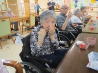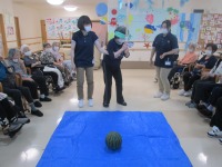 本日は、暑い夏にぴったりのスイカ割りをしました!スイカを見るなり皆様の表情がパッと明るくなりました。スイカと叩き用の棒をご用意し、目隠しをして狙いを定めてスイカを叩いていただきました。「子供の時以来だよ。楽しみ」「絶対割ってみせるよ~」と気合の入ったお言葉が聞けました。また、他の方が叩く時は、「まっすぐまっすぐ、右だよ、いやもう少し左」とアドバイスもいただけました。充分楽しんだ後は、おやつに初スイカを召し上がっていただきました♪