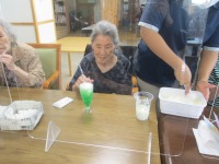 こんにちは、デイサービスです。今日は来月の夏祭りで行う予定のだんべえ踊り、炭坑節、東京音頭の練習を行いました。だんべえ踊りでは「そうだんべぇ」の掛け声や鳴る子をふっていただきました♪炭坑節は皆さんにはなじみ深いので音楽が流れると自然と体が動いていらっしゃいました(^O^)練習で頑張った後はメロンシロップとソーダ水で作ったクリームソーダを召し上がっていただきました。「甘くて冷たくて美味しいよ。」と嬉しい感想を聞くことができました。