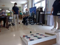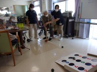 本日は、大人気のパターゴルフを行いました。一人五球ずつで数字が書いてある的を狙ってボールを入れ、合計点で競いました。ゴルフ経験者の方もいればデイサービスで始めてやったという方もいらっしゃいました。「頑張って、ナイスイン!」「大丈夫だよ。リラックスして!」と他の方の時にも声援を送り合い仲の良い様子も見られ楽しんでいただきました(^O^)