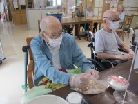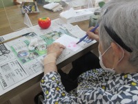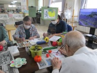 本日は、リンゴや桃・菊の花・ほおづき・きゅうり等のレプリカを見ながら、中には好きなお花を思い浮かべながら絵手紙に取り組まれました。「夏だからひまわりを描こう」「きゅうりのように長く生きよう」と仰り、皆様楽しそうなご様子でした。完成した作品は、おやつを食べながら観賞されました(^O^)お疲れ様でした。