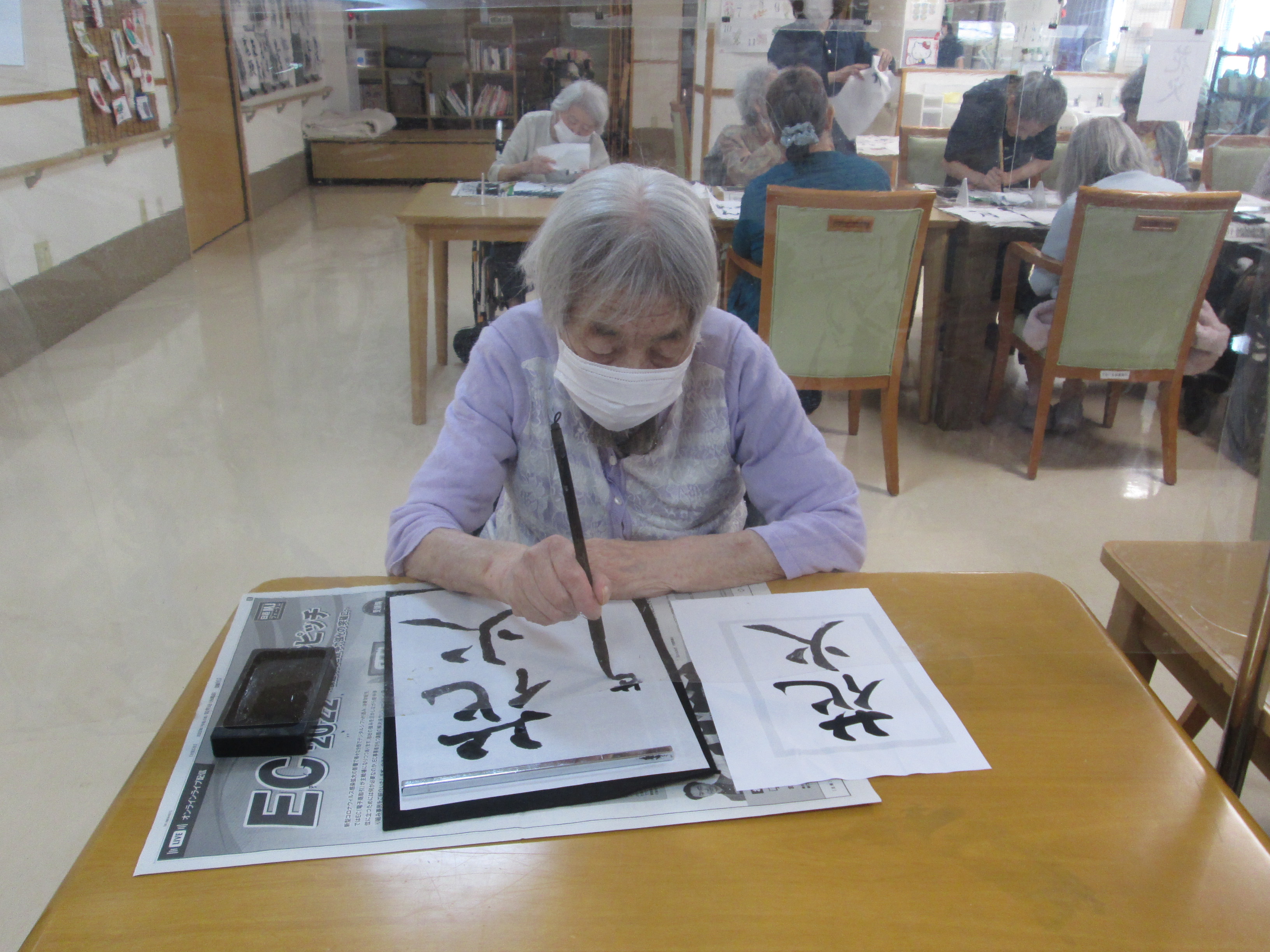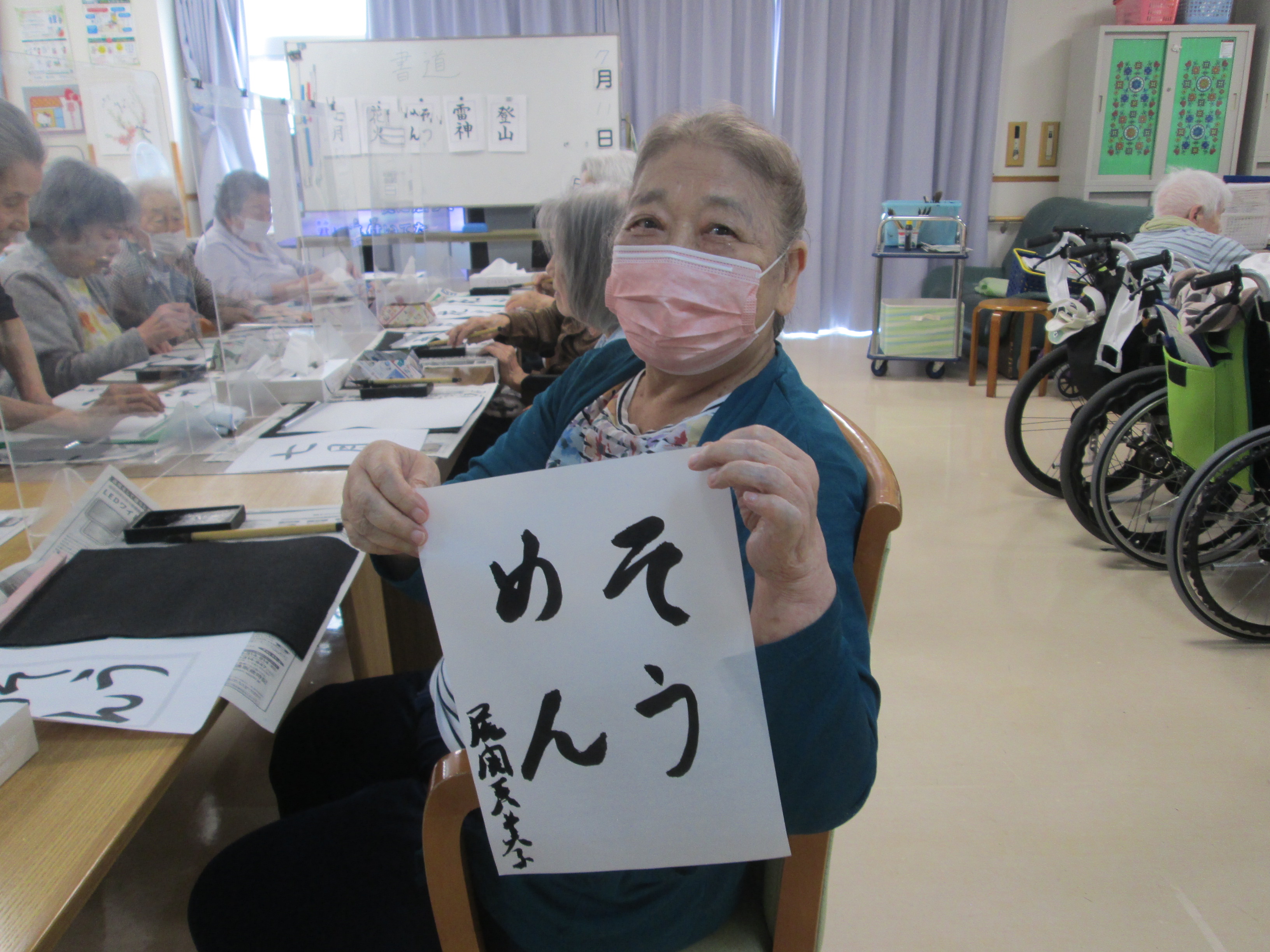 本日は、お習字をしました。「花火・七月・登山・そうめん・めんつゆ・雷神」の夏らしい見本を見ながら取り組んでいただきました。「花火を書きたい!」「夏はやっぱりそうめんでしょ」「お習字は久しぶりだよ」と色々な感想を聞くことができ楽しんでいただけたご様子でした(^_^)