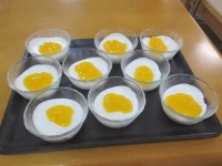 本日は、レアチーズ風ヨーグルトケーキを作りました。材料は、ヨーグルト・砂糖・バター・生クリーム・ゼラチン・クッキー・マンゴーソースを使用しました。ヨーグルトはあらかじめ水切りをしておきました。皆様には袋に入れたクッキーを手で砕いていただき、他の材料は全てボールに入れ混ぜていただきました。器にクッキーを敷きその上に流し込んだら冷凍庫で15分程冷やしマンゴーソースをかけたら出来上がりです。「クリームチーズを使ってないのにレアチーズケーキみたい」「簡単に出来てしかも美味しい」と大変喜んでいただきました。今の季節にぴったりの爽やかなおやつになりました(^O^)