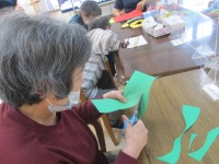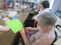 こんにちは、デイサービスです。今日は夏の壁面制作に取り組んでもらいました。テーマは海です。イルカ、サンゴ、南の島、サメ等の海といえばで連想されるものを色画用紙で作ってもらいます。下書きは職員が行いましたが、敷島デイのご利用者様は手先がとても器用なのでハサミであっという間にそれぞれの海に関するものを切り取って仕上げてくださいます。完成まではもう少し時間がかかりそうですが、デイルームに海の光景が広がるのが今からとても楽しみです(^O^)