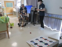 室内レクリエーションでパターゴルフをしました。数字が書いてある穴にボールを入れて行います。ゴルフ経験者の方も多く、初めての方やあまりやった事がない方にも優しく教えてくださいました。「落ち着いて振ればボールに当たるよ」「頑張って!大丈夫だよ」とお互い応援し合いながら楽しく出来ました(^_^)
