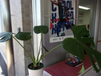 玄関には少し涼しさを感じる大きな葉の観葉植物が置いてあります。