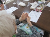 本日は、マッサージをして癒しのひと時を過ごしました。色々な種類のハンドクリームの中からお好きなものを選んでいただき職員により各手のツボの説明をした後ご自身でハンドマッサージをしました。労宮ろうきゅう(こぶしを握ったときに中指と薬指の先が接するところの間)の効き目は、疲労回復・自立神経を整える・集中力を高めるなどです。その他には後渓や胃腸点や魚際等ツボがあるそうです。「自分でマッサージするのも気持ちがいいね」「クリームの良い香りがして癒されるよ」と皆様の気持ち良さそうな表情が見られました。