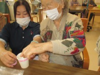 本日のレクリエーションは、小物入れ作りをしました。紙コップにシールやマキシングテープを貼ったり、ペンで好きな絵を描いていきました。「簡単にこんなにかわいい入れ物ができるのね」「私は富士山の絵を描こう」と楽しそうな感想を聞くことができました♪本日の昼食は、ご当地グルメ~愛媛県編~でした。メニューは、ご飯・味噌汁・せんざんぎ・いもたき・フルーツでした。せんざんぎは、唐揚げのようなもので皆様美味しそうに召し上がりました(^O^)