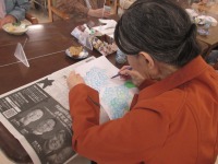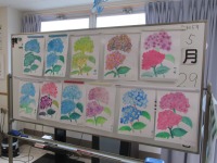 本日は、水彩画を行いました。今の季節に合う紫陽花の下絵を用意し、お好きな色の絵具で自由に塗っていただきました。「何色の紫陽花にしようかな」「花びらがたくさんあるから塗るのが大変だな」と悩まれていましたが、楽しそうに取り組んでいただけました。紫色・青色・黄色・ピンク色等の紫陽花でデイルームがパッと明るくなりました♪