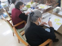 今日は、水彩画教室の日でした。今回は、春らしく菜の花の下絵を準備しました(^O^)だいたい使う色は黄色と黄緑でしたが、それぞれ薄く塗ったり濃く塗ったり変化をもたせることで個性が出ていました!完成した作品を前に貼らせていただき、鑑賞会をしました。「あたなの上手ね~」「あなたのほうが上手よ」と褒め合う皆さまでした♪