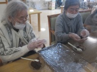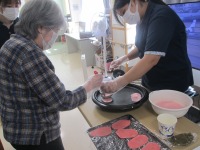こんにちは、デイサービスです。今日は3月3日のひなまつりだったので、料理教室レクで桜もち作りを行いました。白玉粉、小麦粉、砂糖、水で生地を作ってホットプレートで焼きます。丸めたあんこを包んで桜の葉っぱを巻きつければ完成です。デイルームがほんのり桜の香りに包まれました(^O^)美味しいと大好評でした。そしてご利用者様の強いご要望で今日は桜もちのおかわりもご用意させていただきましたが、あっという間に完売となりました(笑)