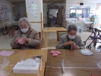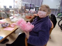 今日は、壁面制作をしました。テーマは「桜」です。ピンク色のお花紙を蛇腹にして開くと桜の花になります。茶色のお花紙を一枚一枚丸めていき桜の木に使います。満開の桜の花と木のお花紙を壁に直接貼っていくので、かなりの数が必要になります。「お花紙を使って桜の花が出来るのね」「たくさん作らないといけないから大変だな」と皆様黙々と楽しみながら取り組まれました。完成までまだまだ時間がかかりますが、陽気も暖かくなり本物の桜と共に楽しみです(^O^)