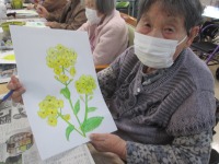 こんにちは、デイサービスです。今日は菜の花の水彩画教室を行いました。水彩画なので絵具で色塗りをしていただくのですが、強いこだわりで色鉛筆で塗ってくださる方もいらっしゃいます。皆さん集中して黙々と作業に取り組んでくださっていました。完成作品をホワイトボードに並べると、とても見ごたえがあります。「〇〇さんの絵は素敵ね。」等、お互いを褒め合って鑑賞会が行われていました。ちなみに作業中のBGMは朧月夜を繰り返し流していました(*^_^*)