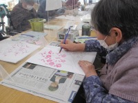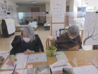 本日は梅の花の水彩画を行いました。絵具、色鉛筆、クレヨン等ご用意し、お好きなものを選んでいただきました。ピンク色・赤色・黄色・茶色・緑色を載せて塗られる方が多く、同じ色合いでもそれぞれ違う春らしい梅の花が完成しました。「梅の花は良い香りがするよね」「春を感じるね」と皆様あたたかい気持ちになられたご様子でした。デイルームの水彩画コーナーに飾らせていただきパっと明るくまりました(^O^)