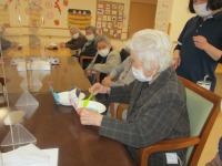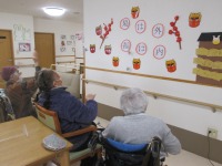 昨日に引き続き、節分会を開きました!豆まきや節分ゲームを行いました。豆まきでは、男性利用者様が大きな声で「鬼は~外!福は~内!」と掛け声をして下さり、大盛り上がりでした。また、節分ゲームでは鬼やお福のお面が貼られた的当てにボールを投げ、点数を競いました。会が終わり、「楽しかったね、みんなでやったんだから鬼が払えただろう」と楽しんでいただけたようでした♪