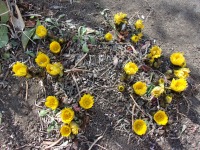 敷島の花壇で一番陽当たりの良い場所に植えてある福寿草が、数週間前よりもたくさん元気に顔を出してくれました。