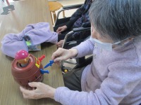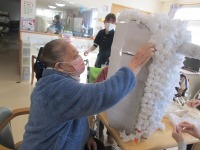 今日はウサギのモニュメントを作りました。段ボールでウサギの頭と体を作り、お花紙を丸めて貼っていきます。「完成が楽しみだわ」「ウサギ年だから良いのが出来るよ!」と皆様楽しみながら取り組まれました。続きは次回行う予定です(^O^)