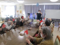 今日のレクリエーションは、紅白の旗上げゲームを行いました!皆様もご存じの通り、「赤上げて白上げないで赤下げる」等、言った通りに紅白の旗を上げ下げしてもらうゲームです。ルールは簡単なものの、ややこしい指示があるとこんがらがってしまい、「あれ!?どっちに赤持っていたかわからなくなっちゃった」という方も…(>_<)旗上げゲームでは頭と体とほぼ同時に使うので、とても脳トレになります!お隣同士で笑い合いながら楽しく脳トレができました♪