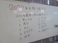今日のレクリエーションは一年を振り返りました。皆様にどんな年だったか聞くと「今年も特にケガも無く平和に過ごせたよ!」「皆と楽しく過ごせました」「おかげさまで元気だったよ」と明るい声が聞かれました。次にクイズをしました。「2022年最後に食べたい物」では1位年越しそば、2位お寿司、3位かに、でした。やはり今夜の夕食は年越しそばを食べる方が多かったです。一年を振り返り今年最後のレクリエーションを終える事が出来ました。今年もありがとうございました(^O^)来年も皆様にとって良い年でありますように☆