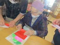 こんにちは、デイサービスです。今日は毎月恒例のご利用者様に大好評のカレンダー制作を行いました。来月1月のテーマはだるまと松と梅のおめでたいものトリオです。ご利用者様にはまずはじめに折り紙でだるまを作っていただいたのですが、この作業がとても難しく、皆様とても苦戦されていました(*_*)難しかったからこそ、完成した時には嬉しさもより多く感じられました。カレンダー部分は色鉛筆でお好きに塗っていただきました。デイサービスご利用日に色を塗って下さるご利用者様が多いです。完成したカレンダーをお互いに見せ合って、大満足の時間が過ごせました(^○^)
