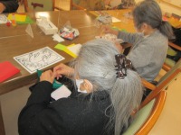 今日のレクリエーションは、ちぎり絵教室でした!今回は雪うさぎと南天の下絵を用意しました。可愛らしい下絵に利用者様も「雪うさぎの親子かな?可愛いね」と喜んで下さっていました(*^_^*)それぞれお好きな色の折り紙を選んでいただきました。暗い赤と明るい赤を組み合わせて貼ったり、細かくちぎる方・大きめに下絵の線の沿ってちぎる方と様々な方法で取り組んでいました。同じ下絵でも一枚一枚雰囲気の違う素敵なちぎり絵が完成していました♪