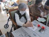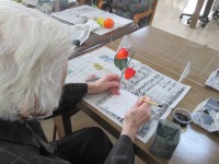 本日は、絵手紙を書きました。みかんや苺の果物やカボチャや人参の野菜のオブジェを用意し、お好きな物を選んで書いていただきました。薄墨で下絵を書いたら絵具で色付けしていきます。最後に一言メッセージを書いたら完成です。「今日は上手に出来た方かな」「美味しそうなみかんが書けたよ」と楽しそうなご様子でした。皆様の素敵な作品を飾りデイルームがパッと明るくなりました♪