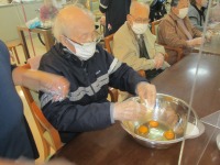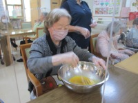 こんにちは、デイサービスです。今日は甘納豆入りパウンドケーキを作りました。ホットケーキミックスと卵とバターと砂糖をよく混ぜた生地に甘納豆を入れてオーブンで焼きます。「私、甘納豆大好きだから楽しみ。」と焼き上がる前からご利用者様から期待の声が上がっていました。こんがり焼けたパウンドケーキは甘納豆がいいアクセントになっていて、「甘くてとっても美味しいよ。」と大好評でした。次回の料理教室も何を作るか今から楽しみでーす(*^_^*)