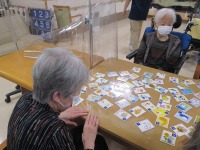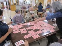 こんにちは、デイサービスです。今日はトランプといろはがるたを使ったカードゲームレクでした。トランプでは皆さんが大好きなババ抜きと神経衰弱を行いました。ババ抜きでは敷島デイサービスのご利用者様は正直すぎるので誰がジョーカーを持っているのかすぐにわかってしまうという微笑ましい場面があったり、神経衰弱ではお互い答えを教え合ったりというチームワークも見られたりしました(*^_^*)いろはがるたチームのご利用者様もいちばん多くかるたを取れるようにと皆様とても真剣に取り組んでくださっていました。カードゲームに集中したので15時のお茶がいつもより美味しく感じました♪