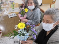 こんにちは、デイサービスです。今日はフラワーアレンジメントを行いました。今月のお花は黄色のガーベラ、青色のスターチス、白色のカスミソウでした。同じお花を使っていてもアレンジする利用者様によって完成作品の印象が全く違います。敷島デイの皆さんはとても仲が良いので、完成するとお互いの作品を褒め合います(*^_^*)今日も楽しい時間が過ごせました♪