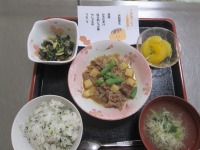 こんにちは、デイサービスです。今日の昼食は月に一度のお楽しみのご当地グルメ、広島県編でした。メニューは菜飯、かきたま汁、呉の肉じゃが風、ちしゃもみ、フルーツでした。ご当地グルメの日は小さいメニュー表を全員のお善につけてくれるのでご利用者様もメニューを見ながらとても楽しそうに召し上がっています。「菜飯って広島県の食べ物なんだね。」「広島県といえばもみじまんじゅうだね。」と食後の会話が弾んでいました(^○^)