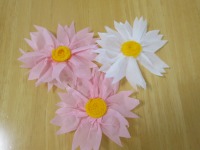 こんにちは、デイサービスです。今日は秋の壁面制作教室でした。テーマはコスモス畑です。ピンク、白、オレンジ色のおはながみでコスモスの花びらを作り、お花の中心部分は毛糸をぐるぐる巻いて作りました(^○^)コスモス畑を表現したいので、たくさんのコスモスが必要となります。手先が器用なご利用者様に頑張ってたくさん作っていただきました。初日の作業はここまででしたが、この後、茎や葉っぱの部分も作成してから完成となります。壁面に飾られる日が今から待ち遠しいです(*^_^*)