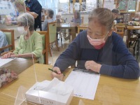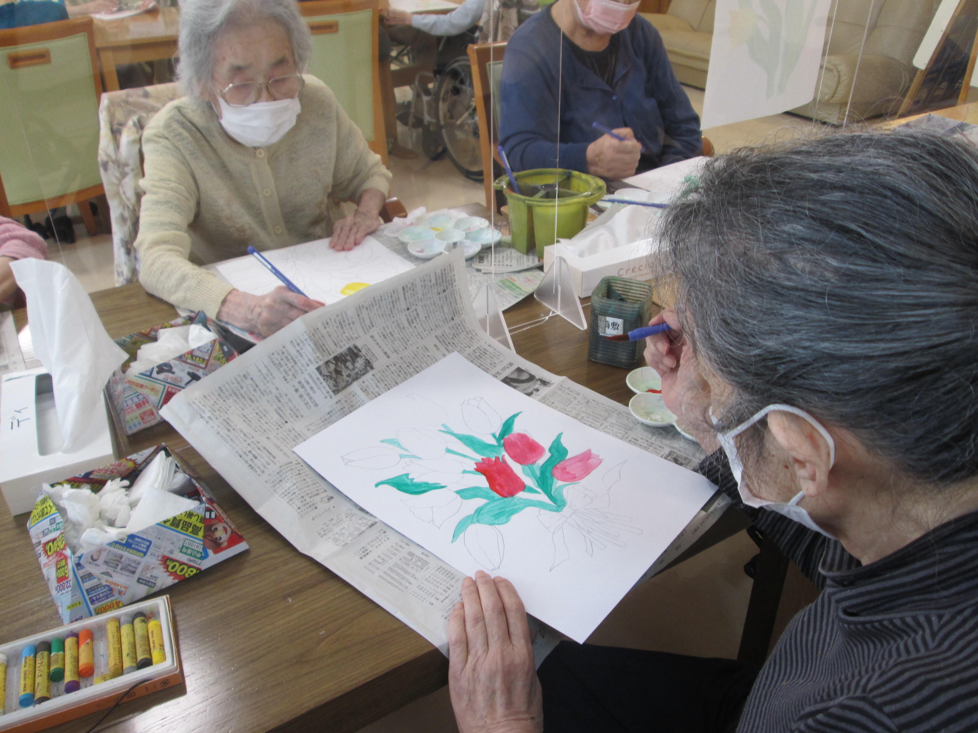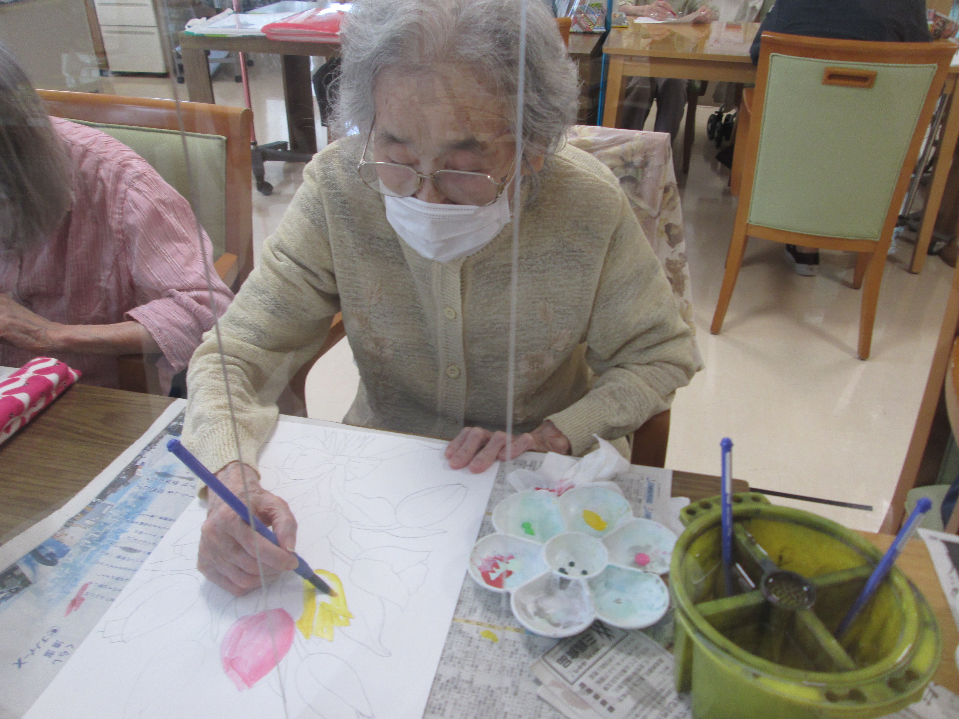 今日のレクリエーションは、水彩画教室を行いました。チューリップ・柿・紫陽花・トウモロコシの中からお好きな絵を選んでいただき絵具・色鉛筆・クレヨンの中から自由に選んでいただきました。「美味しそうなトウモロコシがいいな」「秋は柿が旬だよね」「どうに塗ろうかな…」と様々な声が聞かれましたが皆様集中して楽しそうにとりくまれました。出来あがった作品はデイルームの水彩画コーナーに貼らせていただき、皆さんと拝見したいと思います(^O^)