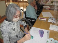 今日は水彩画教室でした。今回はナスやトマトなどの夏野菜の下絵に各々お好きな色で色付けして頂きました!色付けする道具も、水彩絵の具・色鉛筆・クレヨン等の中から選んで取り組んでいただきました。お隣の席の方と「あなたのトマトは美味しそうね~」と言い合いながら、楽しそうに色を塗っていらっしゃいました(^○^)