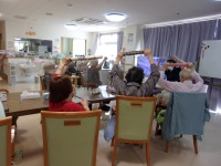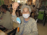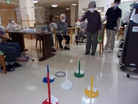 こんにちは、デイサービスです。今日は棒体操と輪投げゲームを行いました。まずはじめに棒を使って、音楽に合わせて体を伸ばします。両腕、背筋、腰回り等、痛気持ちいい位でやるのがポイントです。身体がウォーミングアップしたところで輪投げに取り組んでいただきました。投げる先には点数が書いてあるので皆さん高得点目指して、頑張ります。敷島デイのご利用者様は皆さんとても仲が良いので、ご自分の順番ではなくても、一生懸命に応援や投げるポイントをアドバイスして下さいます(^○^)わきあいあいと楽しい時間が過ごせました♪