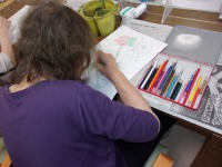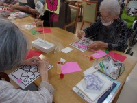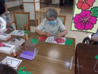 まずはハイビスカスを何色にするか考え、決めた色の折り紙を細かくちぎって、糊で貼って行きます。繊細な作業なのでデイルームが静まり返っていました(゜o゜)作業量も多いので時間内に仕上げられた方は少なく、できなかったご利用者様は残りはお昼休みなどを使って完成させていただきたいと思います(^O^)