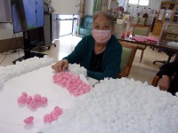今日はキティーちゃんの巨大パネル作りを行いました。お花紙を小さくまるめたものをキティーの形に模ったパネルに貼って行きます。今日はキティーちゃんにピンクの服を着せてみました(*^_^*)皆様、「可愛いね~」と笑顔多く取り組んで下さっていました。完成が楽しみですね♪