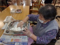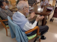今日のレクリエーションは音楽レクでした。まず、あんたがたどこさの曲に合わせての体操を行いました。歌いながら動作を増やしたり、徐々に難易度を上げていきます。最初は「全然大丈夫だ」と余裕のあった方も、「疲れたなぁ、休憩しよう!」と仰るくらい沢山体を動かしました。最後はみんなで懐かしの童謡を歌い、終了しました。「今日はうんと体を動かしたから夜よく眠れそうだよ」と話され、有意義な一時間となったようでした(*^_^*)
