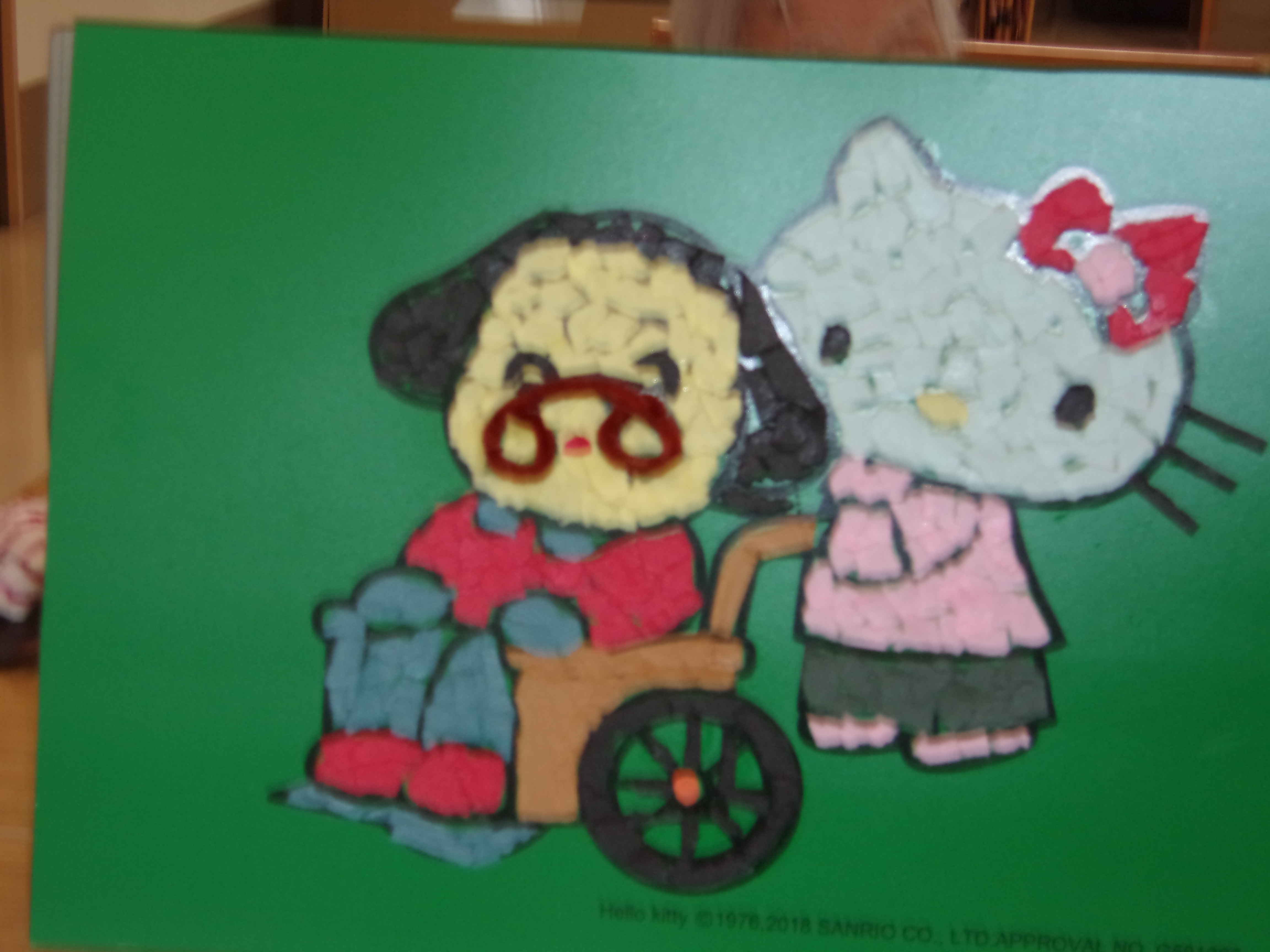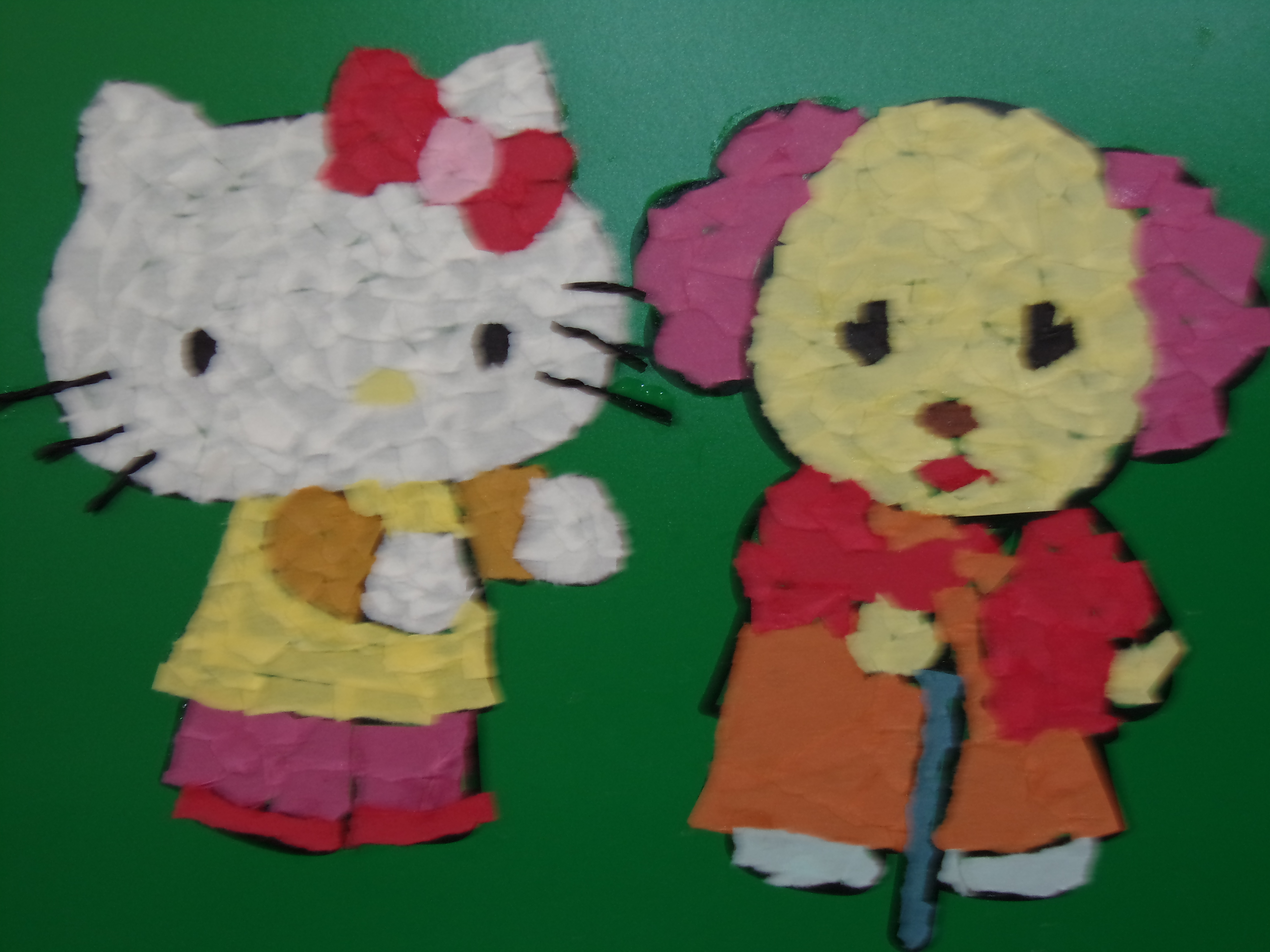 今日のワークショップは先月の続き、『ちぎり絵キティ美術館』の作品を完成させました。