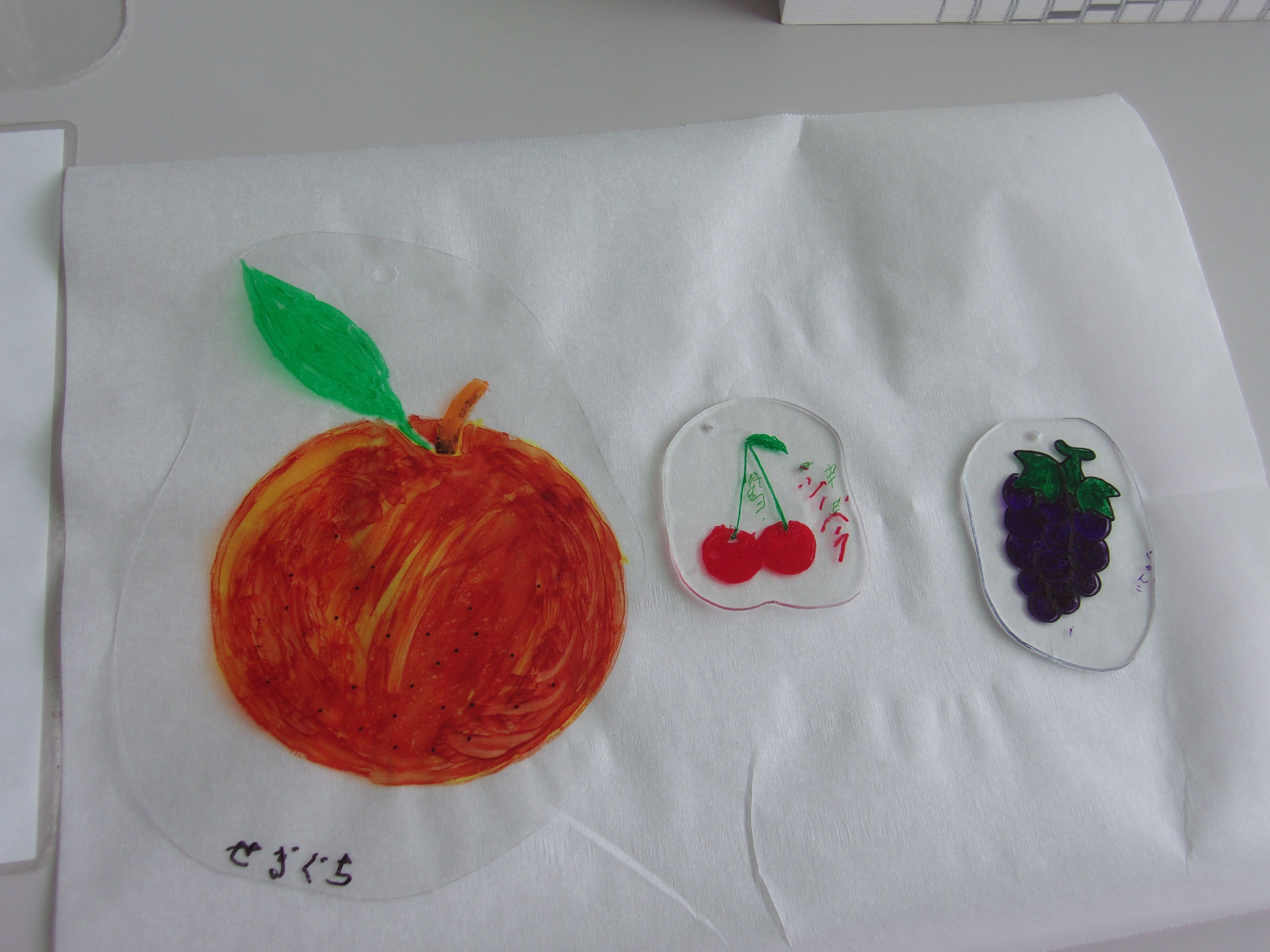 プラスチックの板に果物や自分の名前を書いて、オーブントースターで焼き上げるとギュッと縮んで小ぶりなキーホルダーの完成です!!