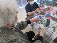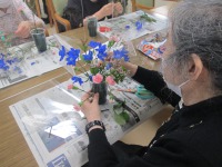 今日は月に一度のフラワーアレンジメントの日でした!今回届いたお花は、カーネーション・チース・デルフィニウムです。青色のデルフィニウムがとても鮮やかで綺麗でした。各々、お好きな長さにカットして配置も考えながら生けていきます。敷島デイの皆様はお花を習われていた方が多数いらっしゃるので、皆様とても素敵な作品が完成していました♪来月のフラワーアレンジメントも楽しみですね(*^_^*)