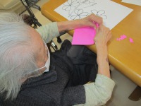 こんにちは、デイサービスです。今日はちぎり絵教室ということなので、いちご、カタバミ、花菖蒲の3種類の下絵からお好きなものを選んで取り組んでいただきました。手先が器用なご利用者様が多いのですが、折り紙を千切る作業は思いのほか大変で、とても苦戦されていました(*_*)下絵が大きめだったので時間内に仕上げることが出来ませんでしたが、お昼休み等を使って完成していただく予定です♪