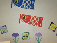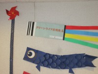 敷島の玄関には、施設の名前入りの吹き流しと親子のこいのぼりが、雨風の影響を受けることなく気持ち良さそうに?泳いでいます。