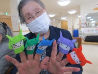 今日は、制作教室にて折り紙で兜の指人形を作りました!色とりどりの可愛らしい兜の指人形ができて、皆様とても喜んで下さっていました(*^_^*)「どこに飾ろうかな~」「ひこ孫にお土産にしよう!」と嬉しそうに持ち帰って下さいました♪