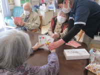 今日のレクリエーションは、カードゲームを行いました。今回は数あるカードゲームのうち、トランプを使ってババ抜きやジジ抜きをしました。なかなか決着がつかず、熱い戦いとなり皆で応援しながら終始にぎやかな雰囲気で取り組むことが出来ました(^O^)次回はまた違うカードゲームをして楽しみたいと思います!