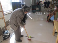 今日は、ゲートボールゲームを行いました。数字が書かれている穴に向かってボールを打ち、その合計点を競って頂きました!力加減によって跳ね返ってしまったりするため、皆様最初は苦戦されていましたが回数を重ねる毎にコツをつかんでいき高得点を出していました(^O^)結果はN様が18点で第一位でした!今回は上位三名の方に賞品を贈らせて頂き、とても喜んで下さっていました♪