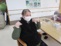 こんにちは、デイサービスです。今日は節分レクということで、鬼のお面をつけた職員に向けて「鬼は外 福は内」と願いを込めて豆まきを行っていただきました。豆まきの豆は個包装の大豆の他におやつにも召し上がっていただけるように個包装の甘納豆を用意してみました(^O^)